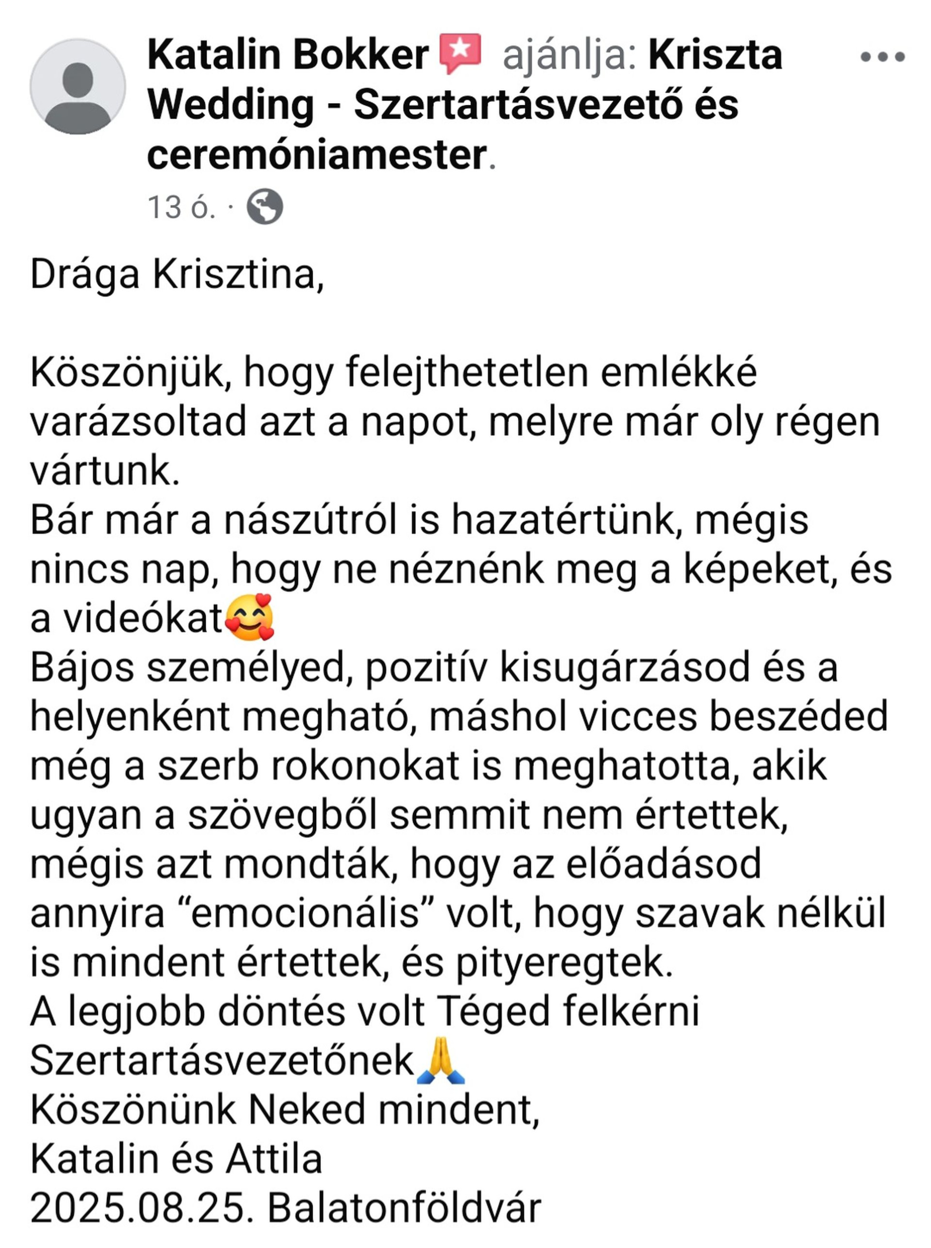 Katalin és Attila az Interneten talált rám, de már első alkalommal nagyon közvetlen hangulatban tudtuk tervezni az igazán egyedi esküvői szertartásukat. Bensőséges hangulat, fantasztikus család és egyedi ötletek tették még meghittebbé a házasságkötésüket, ami a saját kis szállodájukban, a Bagira panzióban, Balatonföldváron volt. Imádtam minden pillanatát, a mindent átható szeretet körülvett mindannyiunkat. Drága Attila és Katalin, éljetek mindig ilyen csodás szerelemben!